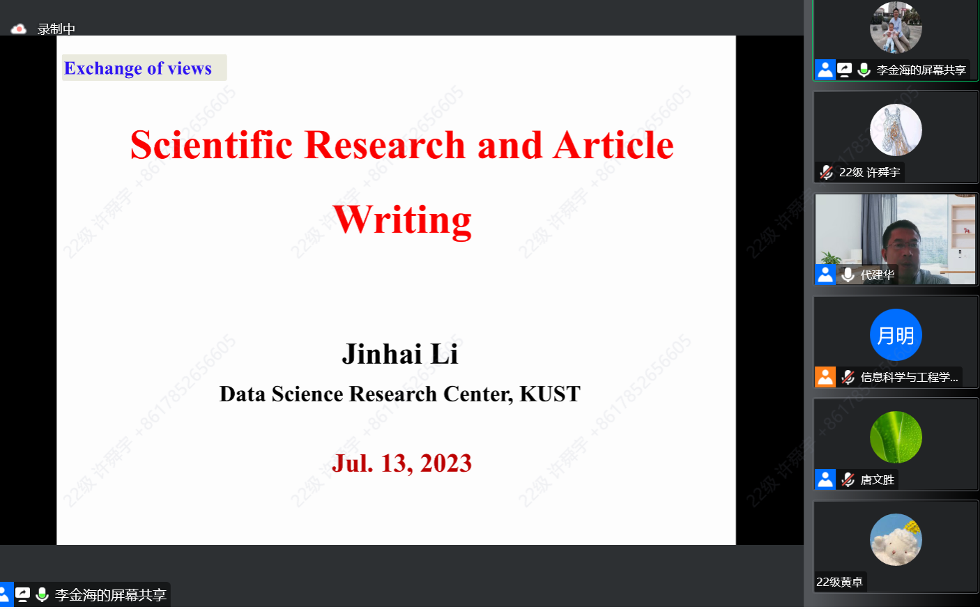 (通讯员:喻昕 史晓龙)7月13日上午,应湖南师范大学信息科学与工程学院邀请,通过腾讯会议,西安交通大学应用数学专业的李金海博士进行了一场关于科学研究与论文写作的线上报告,本次报告由信息科学与工程学院代建华院长主持,科研办组织召开,2021级和2022级研究生及相关老师参加。