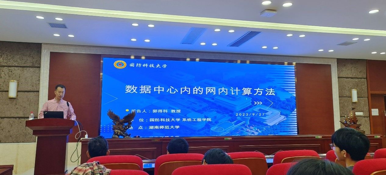 (通讯员:喻昕 史晓龙)9月27日上午10:00,应湖南师范大学信息科学与工程学院邀请,国防科技大学郭得科教授进行了主题为“数据中心的网内计算方法和实践”的学术报告,本次报告由信息科学与工程学院代建华院长主持,科研办组织召开,2021级、2022级和2023级研究生及相关老师参加。