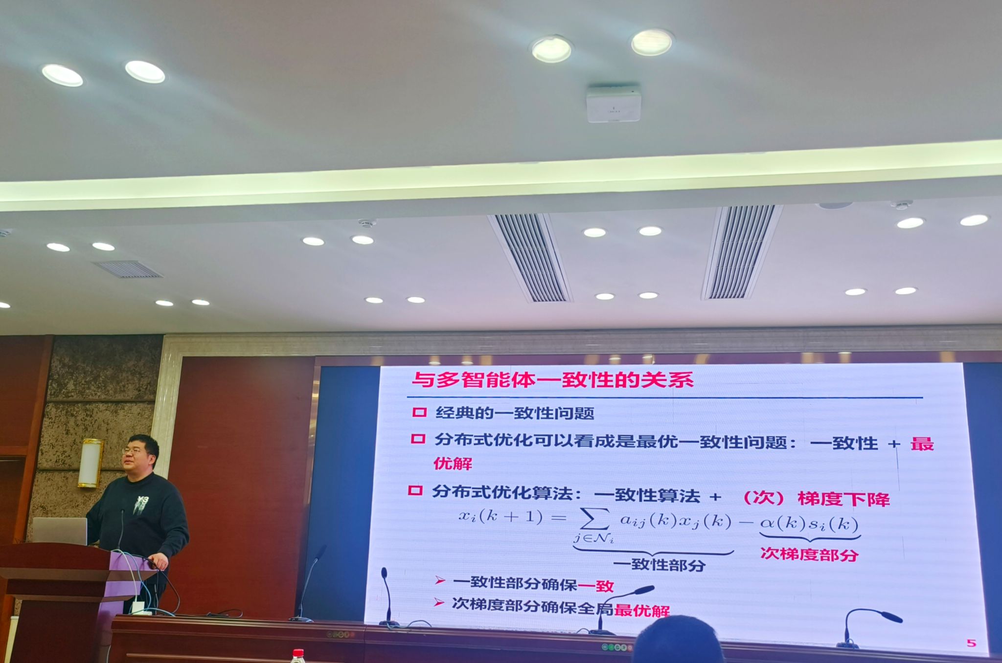 在第二场学术报告中,杨涛教授围绕分布式优化在非凸场景中的应用先提出了一种分布式一阶原始–对偶非凸优化算法,随后为降低智能体间的连续通讯开销,引入了基于事件触发机制的分布式非凸优化算法,并针对通信信道容量受限的问题设计了基于量化通讯的分布式非凸优化算法。三种方法均在理论层面严格证明了收敛性,并通过仿真案例验证了它们在多智能体协同优化中的有效性。