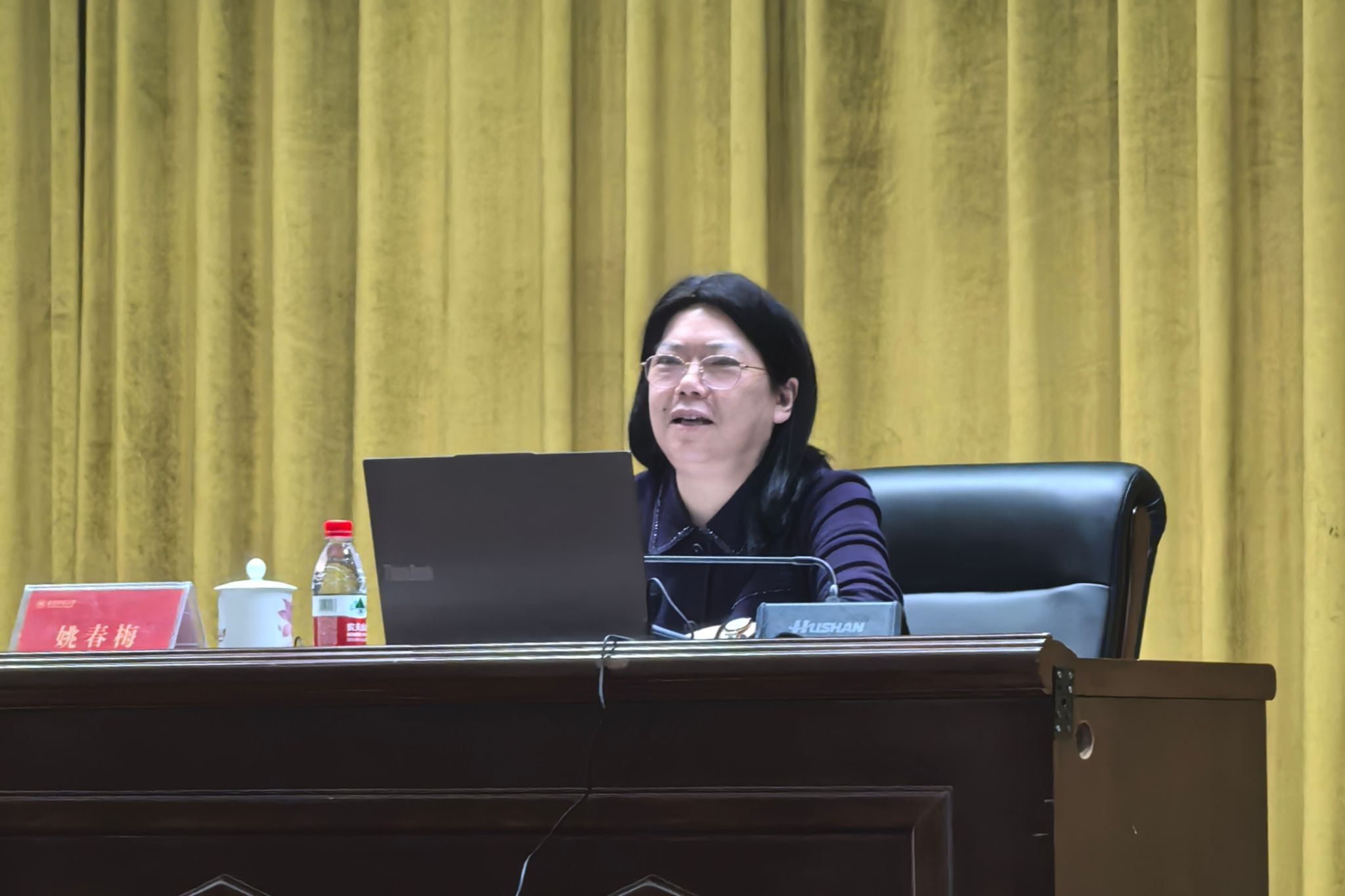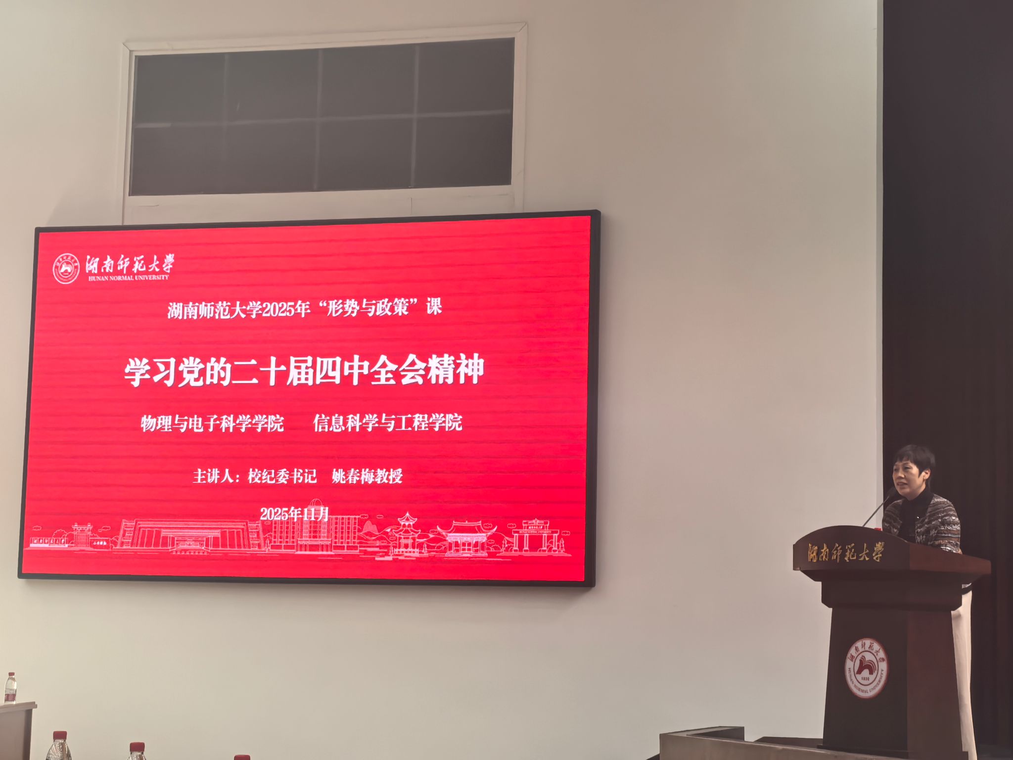 (通讯员 方诗语)为引导青年学子领会党的二十届四中全会精神,把握国家发展战略,将个人成长融入中国式现代化建设,11月27日下午,信息科学与工程学院(以下简称“信息院”)与物理与电子科学学院(以下简称“物电院”)在国际学术报告厅开展以“在接续奋斗中谱写中国式现代化新篇章——学习党的二十届四中全会精神”为主题的《形势与政策》课程,此次课程由校纪委书记姚春梅教授讲授。