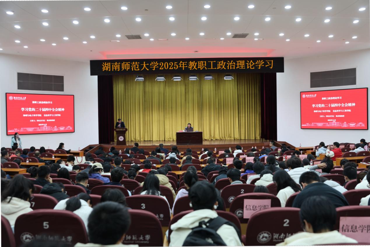 (通讯员 方诗语)为推动党的二十届四中全会精神落地高校教育一线,充分发挥高校教师育人引领作用,11月27日下午,信息科学与工程学院(以下简称“信息院”)与物理与电子科学学院(以下简称“物电院”)在国际学术报告厅开展教职工理论学习。此次学习以“在接续奋斗中谱写中国式现代化新篇章——学习党的二十届四中全会精神”为主题,由校纪委书记姚春梅教授主讲。
