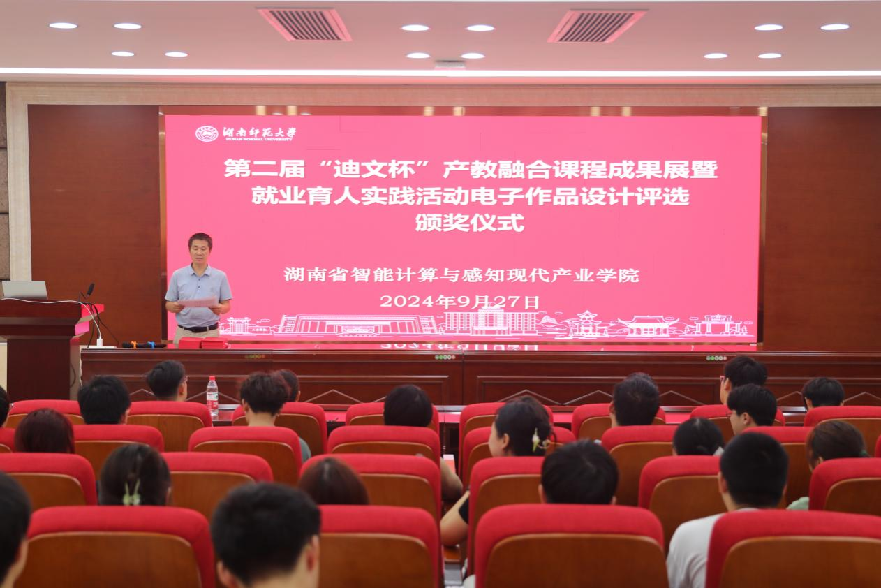 (通讯员 周湘缘)为进一步深入推进校企联合人才培养,推动“智能计算与感知”技术的发展,9月27日中午,湖南省智能计算与感知现代产业学院(简称“产业学院”)联合北京迪文科技有限公司、湖南省迪文科技有限公司(简称“迪文公司”)在中和楼智信讲堂开展了“迪文杯”产教融合课程成果展暨就业育人实践活动电子作品设计评选颁奖仪式。此次活动由我院实验中心副主任邓月明主持,产业学院的智能感知产业班学员参加此次活动。