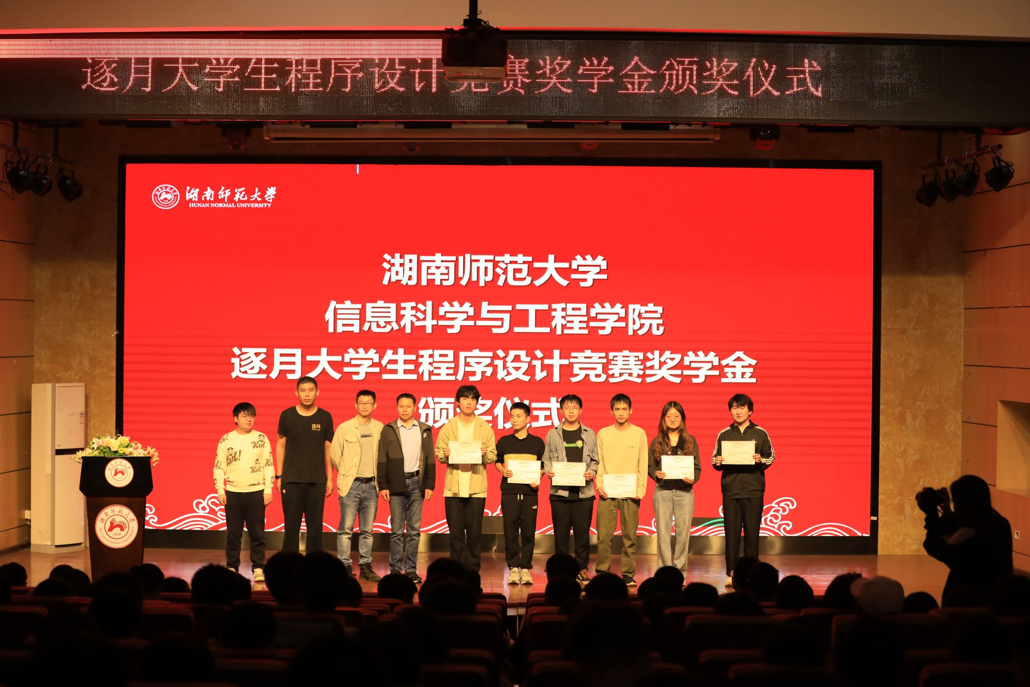 学院首先进行“逐月大学生程序设计竞赛奖学金”竞赛奖学金颁奖仪式。王慧宣读荣获2023-2024学年“逐月大学生程序设计竞赛奖学金”名单,获奖同学上台领奖,相关嘉宾为获奖同学颁奖并一同合影。