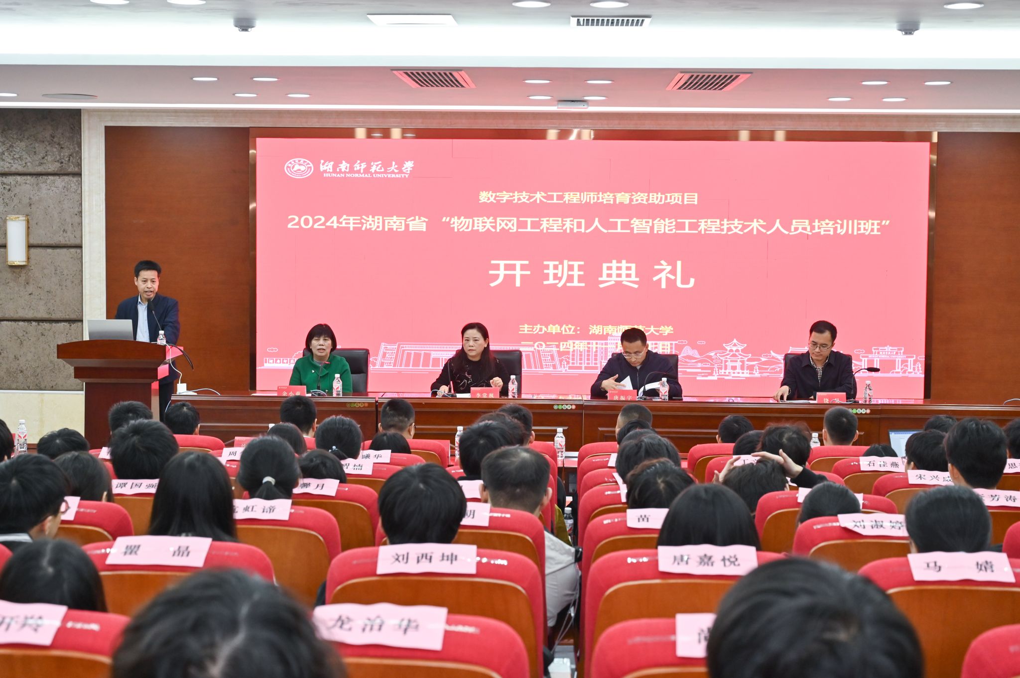 11月17日下午,数字技术工程师培育项目暨2024年湖南省“物联网工程和人工智能工程技术人员”培训班在湖南师范大学信息科学与工程学院举行开班典礼。湖南省人力资源和社会保障厅专业技术人员管理处副处长唐振宇、湖南师范大学人事处副处长饶昊、湖南师范大学信息科学与工程学院党委书记李常枫、副院长余小莉、负责教学的相关教师出席仪式。仪式由信息科学与工程学院成教办主任李玉胜主持。李常枫书记对参加培训班的各位老师和学员表示热烈的欢迎,并对湖南省人社厅领导对此次培训班的大力支持表示感谢。她表示,继省人社厅在中南大学举行“湖南省数字技术工程师培育启动仪式”后,学院及时组建强有力的培训团队,遴选优秀教师,紧扣物联网和人工智能工程技术人员国家职业技术技能标准,精心设计培训课程,科学制定教学方案,开班前的精心准备过程中得到了省人社厅专业技术人员管理处相关负责同志的具体指导。她要求,所有学员珍惜机会,认真学习,确保学有所获。