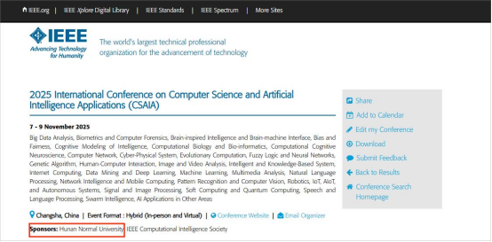 2025计算机科学与人工智能应用国际会议(2025 International Conference on Computer Science and Artificial Intelligence Applications,简写:CSAIA 2025)将于2025年11月7-9日在湖南长沙召开,会议由湖南师范大学和亚洲计算智能学会共同主办、湖南师范大学信息科学与工程学院和湖南师范大学工程与设计学院进行承办、IEEE Computational Intelligence Society (IEEE CIS)提供技术支持。会议将聚焦于计算机科学和人工智能应用领域的前沿发展,旨在促进全球范围内的信息交流与科技创新,加强中外学术合作,共同推动计算机科学与人工智能技术的深入研究与广泛实践。目前会议已进入IEEE官方会议列表和CIS会议列表: