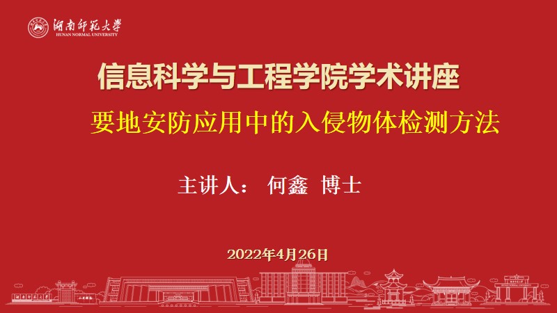 (通讯员 谢颖超 昝慧茹)4月26日上午,湖南师范大学信息科学与工程学院邀请何鑫博士进行了主题为“要地安防应用中的入侵物体检测方法”的线上学术报告。本次报告由副院长唐文胜教授致辞欢迎,科研办组织召开,2019级、2020级、2021级研究生及相关老师参加。