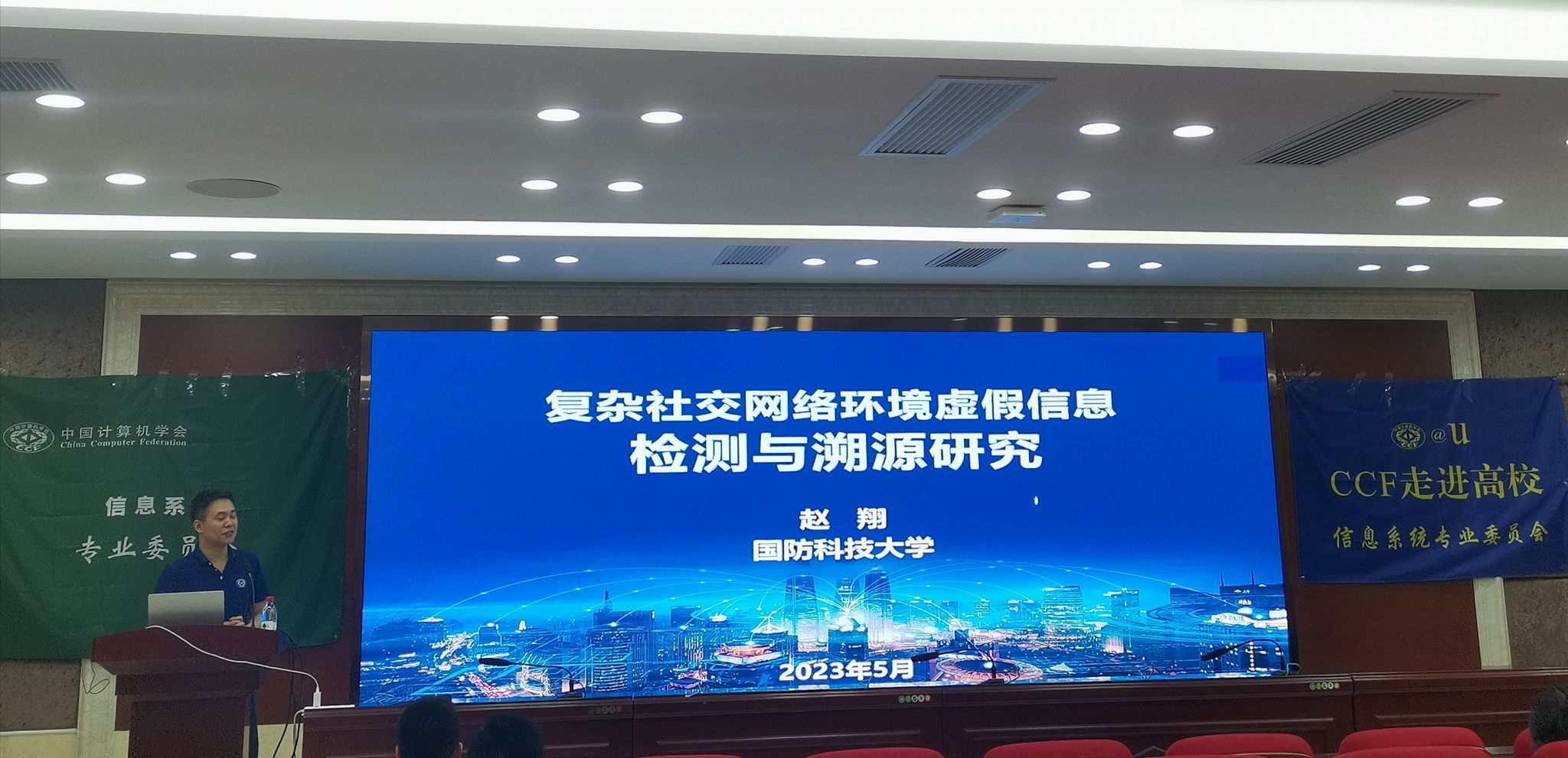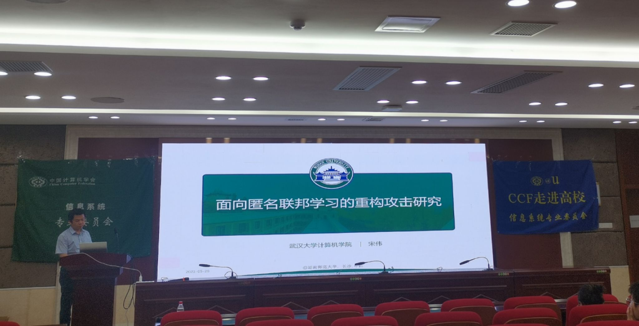 (通讯员:喻昕 史晓龙)2023年5月26日,由中国计算机学会(CCF)主办,CCF信息系统专委、湖南师范大学承办的CCF走进高校活动在湖南师范大学信息学院中和楼342报告厅隆重召开。该活动由天津大学王鑫教授、国防科技大学赵翔教授、武汉大学宋伟教授,分别进行主题为“类ChatGPT语言大模型与知识图谱新进展”、“复杂社交网络下虚假信息检测与溯源研究”、“匿名网络环境下的联邦学习安全机制研究”的学术报告。本次活动由信息科学与工程学院院长代建华教授主持,科研办组织召开,2021级和2022级研究生及相关老师参加。