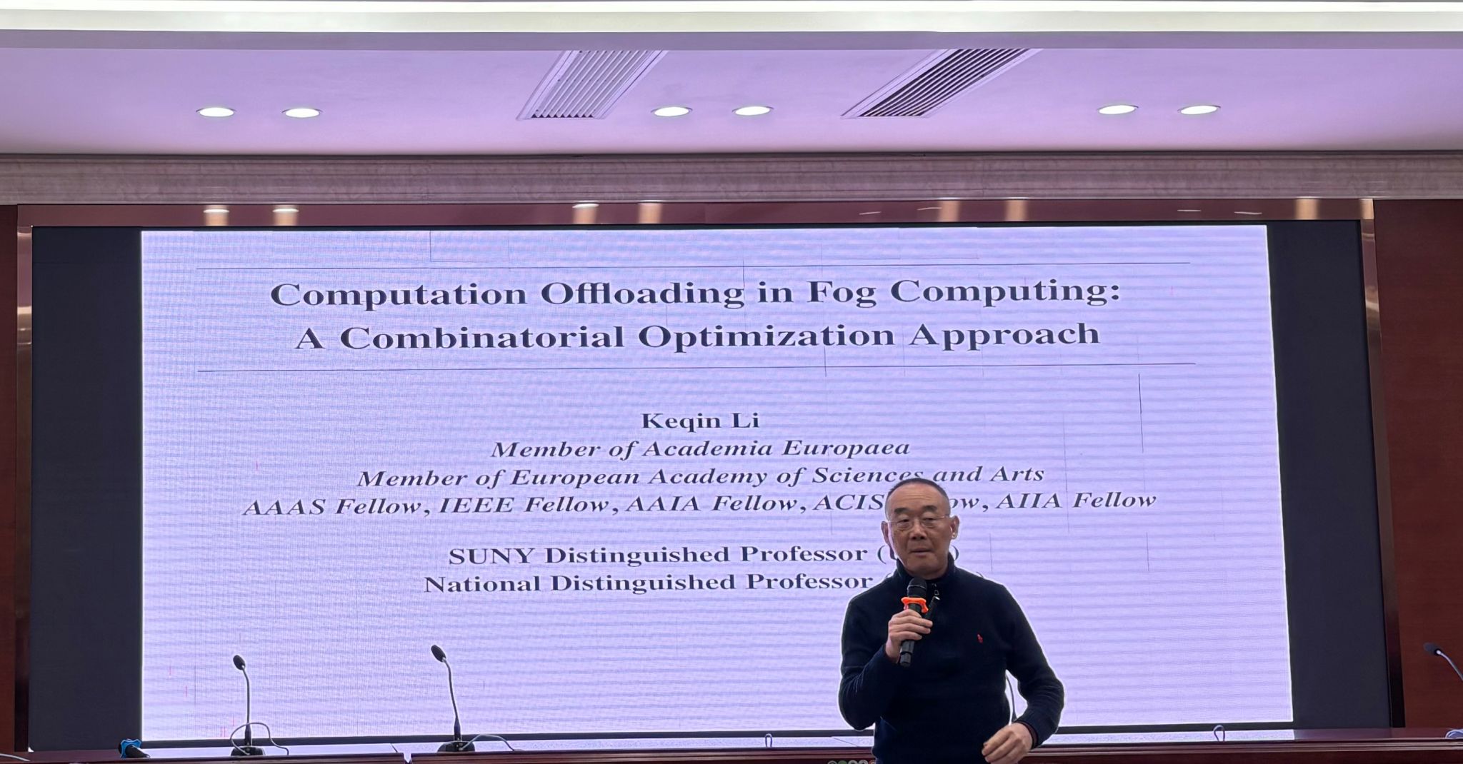 (通讯员:谢东霖 李姗姗)1月7日下午,应湖南师范大学信息科学与工程学院邀请,纽约州立大学的李克勤教授为大家做了主题为“Computation Offloading in Fog Computing: A Combinatorial Optimization Approach”的学术报告,本次报告由信息科学与工程学院张连明教授主持,科研办组织召开,2023级和2024级研究生及相关老师参加。