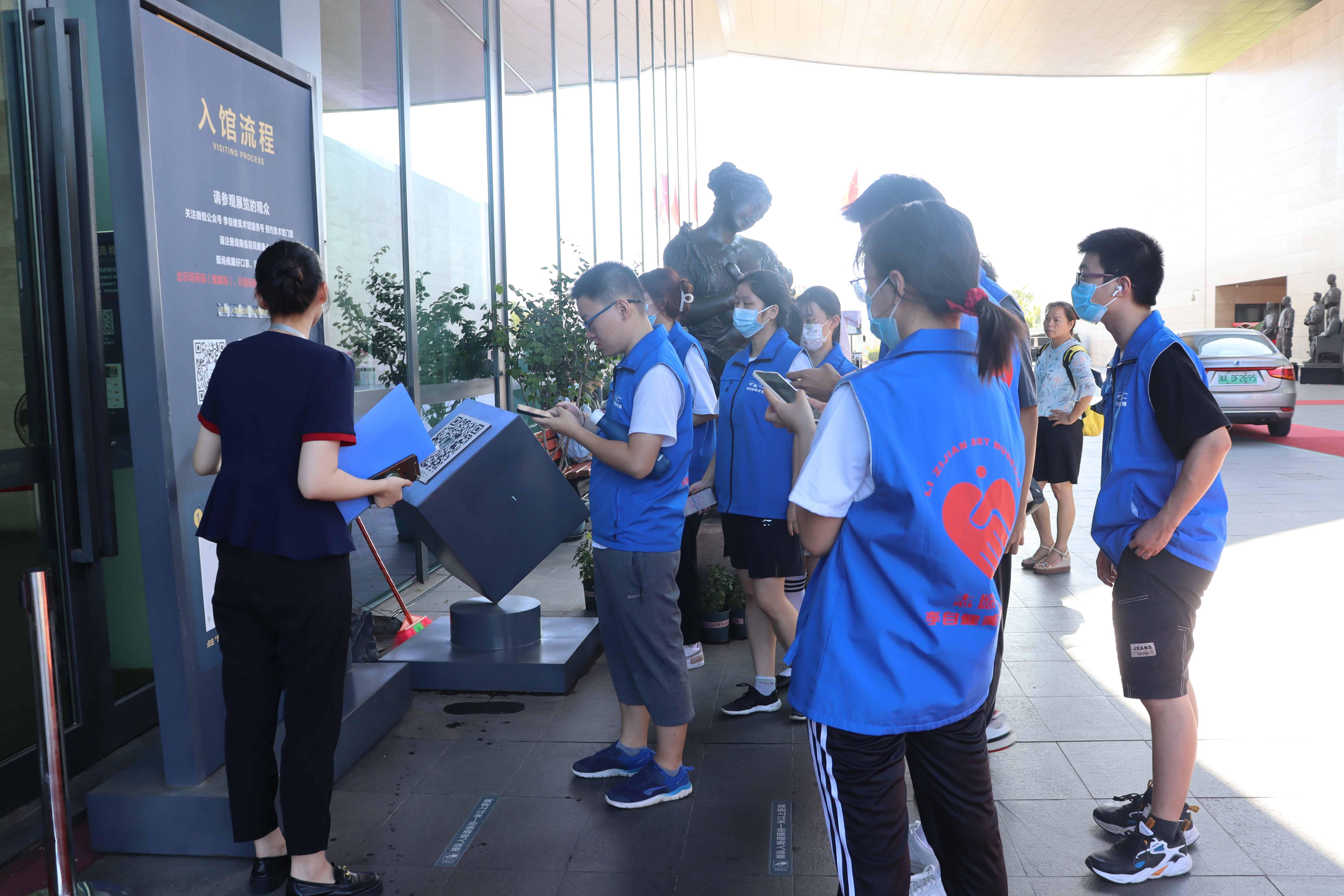 活动伊始,负责人介绍参观顺序和注意事项,安排人员分工,志愿者们负责引导游客、劝阻不文明行为。志愿者的值班采用轮班制,在38度的高温下,志愿者轮流在馆外接待游客。这正是志愿者们互帮互助、传递爱心、乐于奉献、不求回报精神的体现。