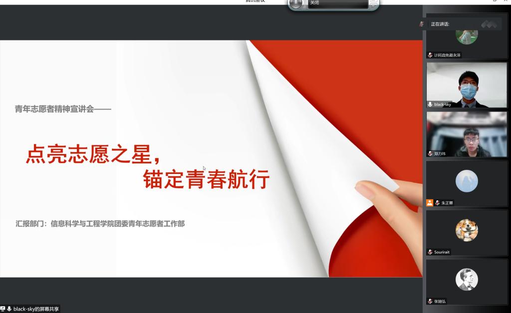 (通讯员 夏永泽 何伊婷)12月1日下午,我院团委青年志愿者工作部以线上腾讯会议的形式开展“点亮志愿之星,锚定青春航行”青年志愿者精神宣讲会。团委副书记肖笛、2022级辅导员李亚楠出席会议,团委青工部廖浩楠担任主持人,我院160余名2021级、2022级学生参加此次活动。