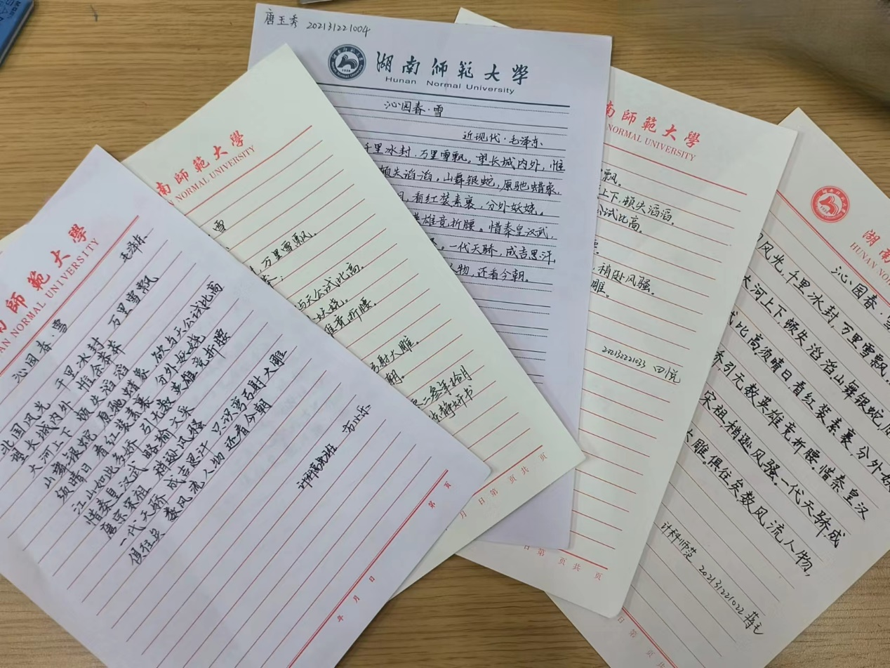 来自2021级人工智能班、计算机科学与技术师范班和高免班的85名参赛选手以《沁园春·雪》为书写内容进行了硬笔书法比赛。随后,于抒含和李丰耘共同对上交的参赛作品进行讨论与评奖,挑选出优秀参赛作品并决定进入学院复赛阶段的选手名单。最后,于抒含和李丰耘对优秀参赛作品进行了展示,既让选手们欣赏到了较为优秀的硬笔书法作品,也让各位同学发现了自己所存在的欠缺和不足。
