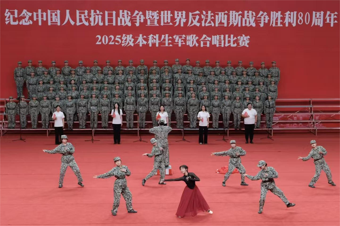 (通讯员 辛施瑶)为厚植新生爱国爱党情怀,进一步培养其集体荣誉感和团队精神,10月18日下午,我校“纪念中国人民抗日战争暨世界反法西斯战争胜利80周年”2025级本科生军歌合唱比赛于江湾体育馆举行。我院120名合唱团成员与其他学院合唱团共同参加。