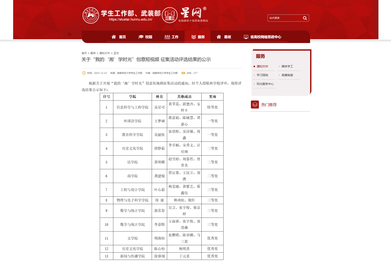 活动自2025年11月26日启动以来,吸引了全校师生的广泛参与。各团队用短视频呈现了在长沙、在湖南师范大学的生活体验与成长感悟。我院吴星可、黄莘霓、游楚泠、安梓丰组成的团队,在2023级辅导员李丰耘的指导下,以“一封家书,半城‘湘’遇”为主题创作作品,最终脱颖而出,获评特等奖。